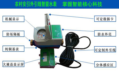 外引线家用水表是将数据显示读写模块(读卡区)与水表控制模块分开成两个单独的部件,两部件通过信号线连接的家用水表,方便水表井这样不便抄表的地方使用,避免坠井事件的发生,更好的保护了用户和抄表人员的安全。